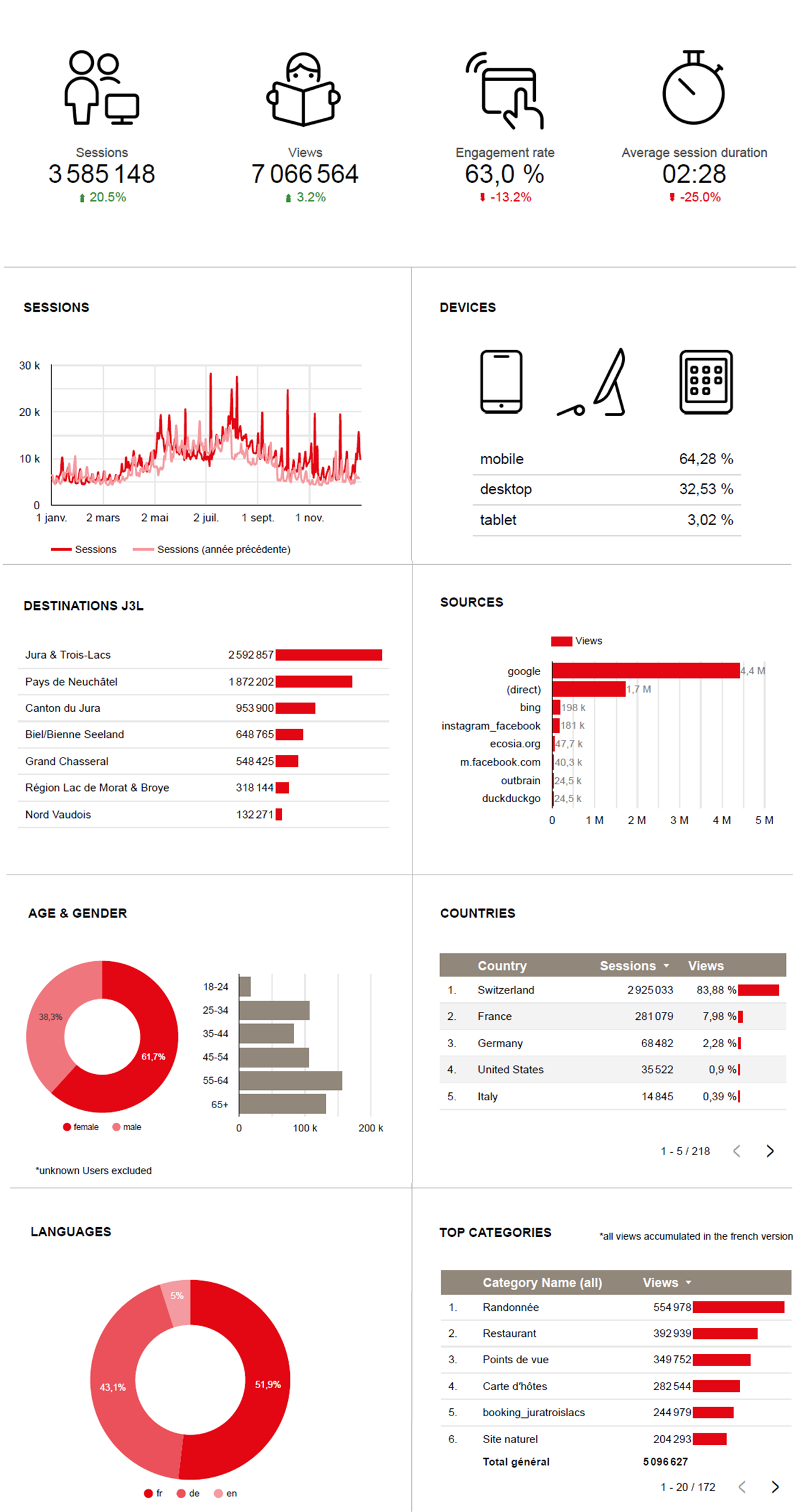 Le site web j3l.ch, véritable vitrine incontournable pour la région et ses destinations, a enregistré cette année une performance globale remarquable. Le nombre de visites a atteint 3,63 millions, affichant une croissance significative de 21,9 % par rapport à l’année précédente. Les vues ont également progressé de 4,1 %, franchissant le cap des 7 millions.